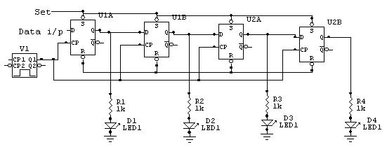 The operation of SIPO is as follows. Lets assume that all the flip-flops ( FFA to FFD ) have just been RESET ( CLEAR input ) and that all the outputs QA to QD are at logic level “0” ie, no parallel data output. If a logic “1” is connected to the DATA input pin of FFA then on the first clock pulse the output of FFA and therefore the resulting QA will be set HIGH to logic “1” with all the other outputs still remaining LOW at logic “0”. Assume now that the DATA input pin of FFA has returned LOW again to logic “0” giving us one data pulse or 0-1-0. The second clock pulse will change the output of FFA to logic “0” and the output of FFB and QB HIGH to logic “1” as its input D has the logic “1” level on it from QA. The logic “1” has now moved or been “shifted” one place along the register to the right as it is now at QA.